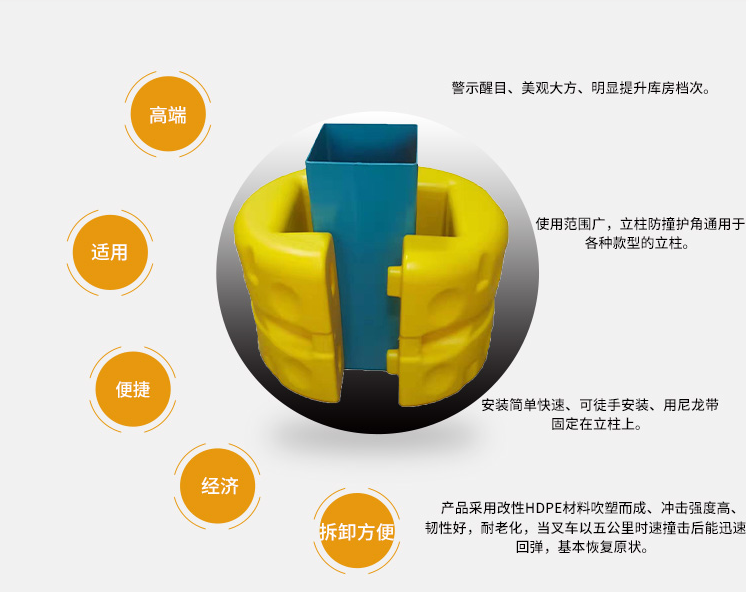 功能介紹:立柱防撞護套是專門為保護鋼平臺立柱以及建筑物支撐柱而設(shè)計的,采用改性LDPE材料吹塑而成,中空結(jié)構(gòu),雙層保護。當(dāng)立柱受到叉車等 設(shè)備撞擊時,能量被護套緩沖吸收,不僅保護了立柱,也保護了搬運設(shè)備。